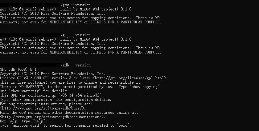 gcc --versiong++ --versiongdb --version三个命令。如果没有提示找不到程序并出现与下图类似的结果,那么编译环境算是配置好了
