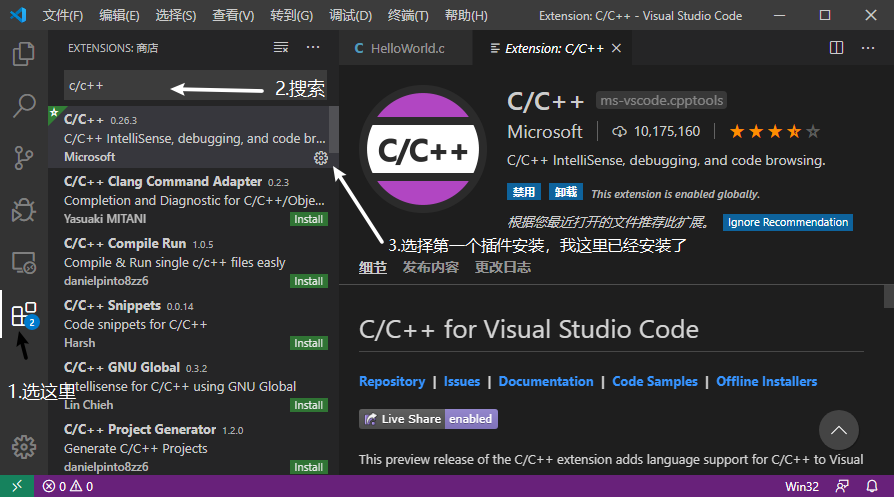 VSCode 可以在官网下载,双击安装之后稍等片刻就可以启动了。进入VSCode之后在左侧选择扩展,搜索C/C++安装插件