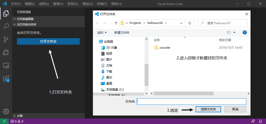接着我们来建一个 C/C++ 项目。新建一个目录,在目录下新建一个.c文件,用 VSCode 打开这个文件夹